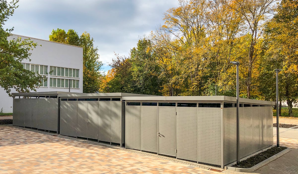 Durch individuelle Gestaltungsmöglichkeiten lassen sich unsere Einhausungen harmonisch in die Gesamtarchitektur integrieren und können zudem hervorragend mit unseren Überdachungen und Boxen kombiniert werden.